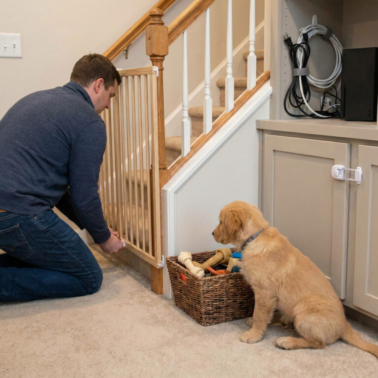 To dog-proof your home, get down to your dog’s eye level to identify potential hazards. Secure specific dangers in every room: lock away toxic foods
