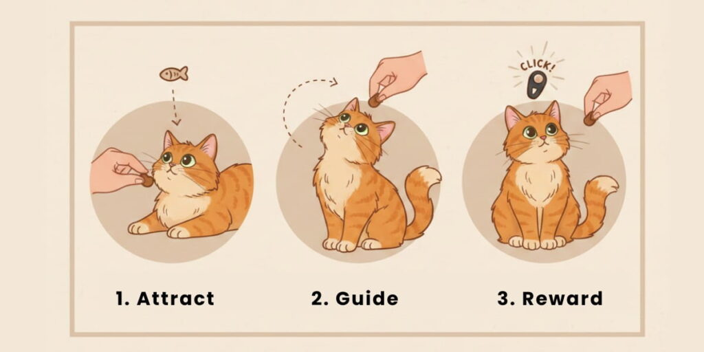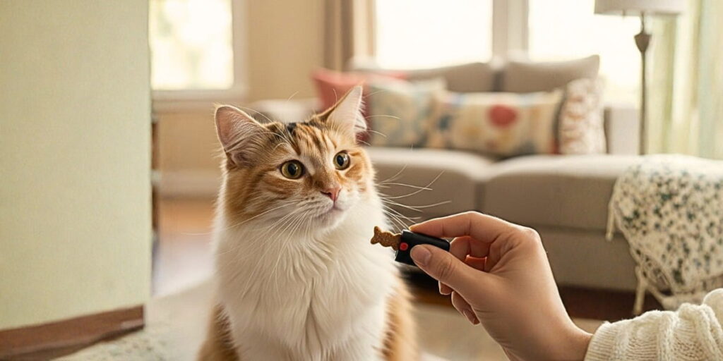- The Marker: The click tells the cat, “That specific movement you just did earned you a treat.”