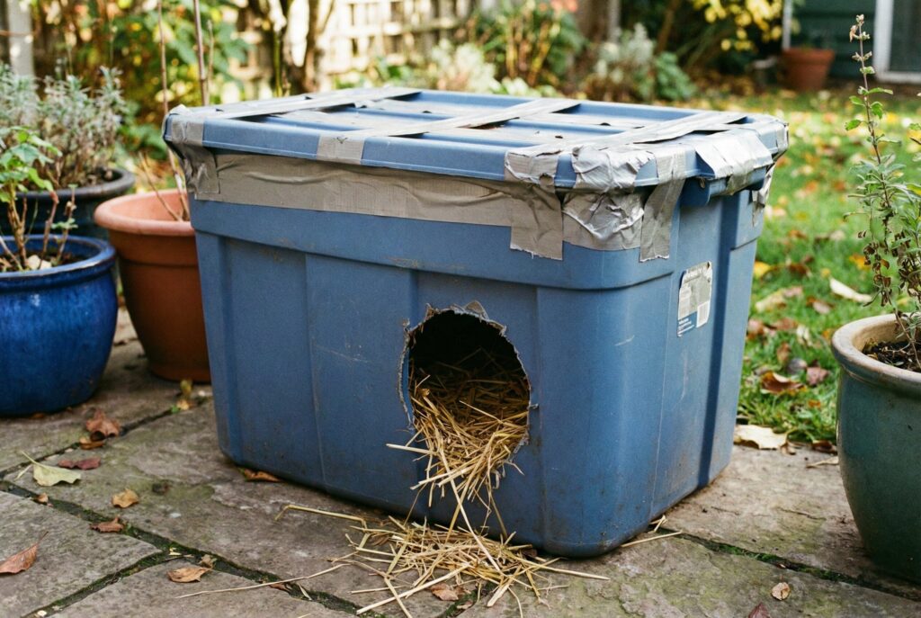 Note: Use straw, not hay or blankets. Blankets hold moisture and freeze outside; straw repels moisture and allows the cat to burrow for warmth. Put the lid back on securely.
