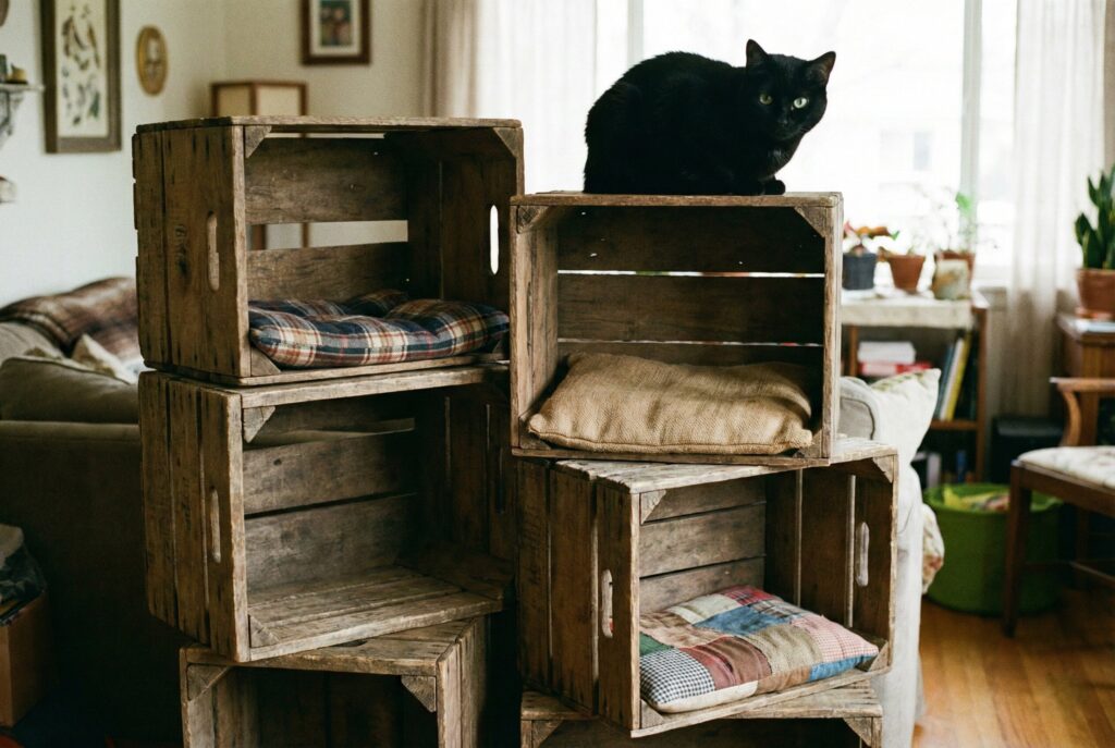 You can cut holes between the crates if you want an internal passage. Line each crate with bedding. The rough wood texture is often appealing to cats for scent marking.