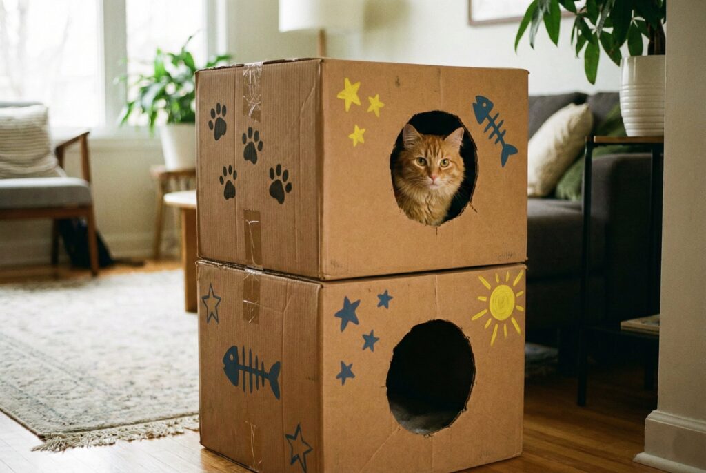 You can customize it by gluing fabric to the outside or stacking multiple boxes to create a two-story “condo” with internal holes for passage between levels. Just add a soft towel inside, and it is ready.