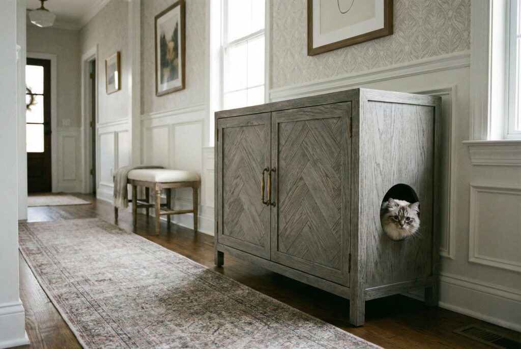 From the outside, these look like standard accent cabinets or sideboards with nice hardware. Inside, they are divided. One side can hold a litter box, hidden from view. The other side can be outfitted with bedding to serve as a private lounge area.
