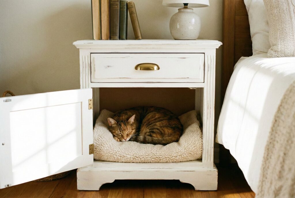 If you have an old wooden nightstand or end table you were planning to donate, turn it into premium cat furniture. This looks much nicer in a living room than cardboard.