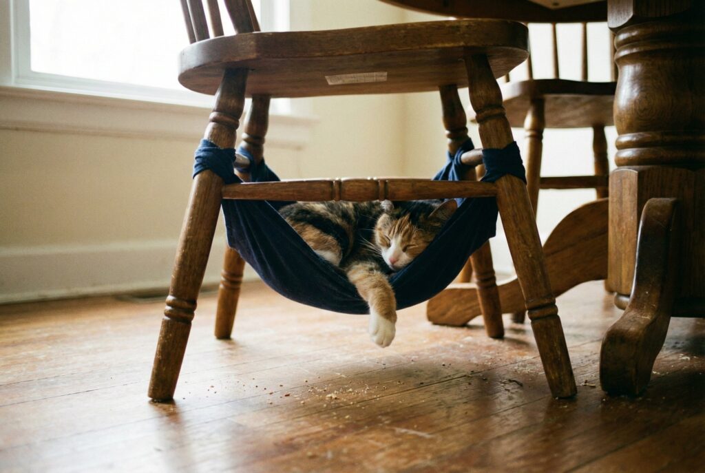 Cats often love sleeping under chairs because it feels protected from above. You can enhance this by adding a hammock element.