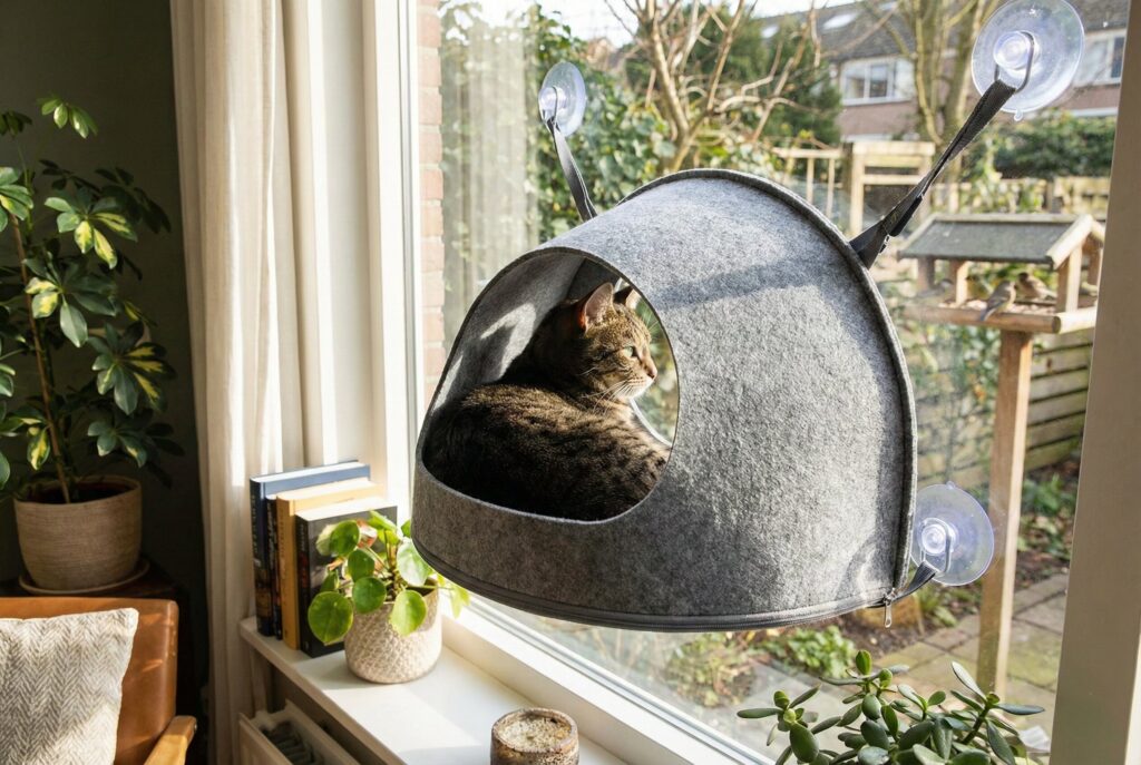 This allows your cat to bask in the sun and watch birds while feeling completely protected within their small “room” attached to the glass.