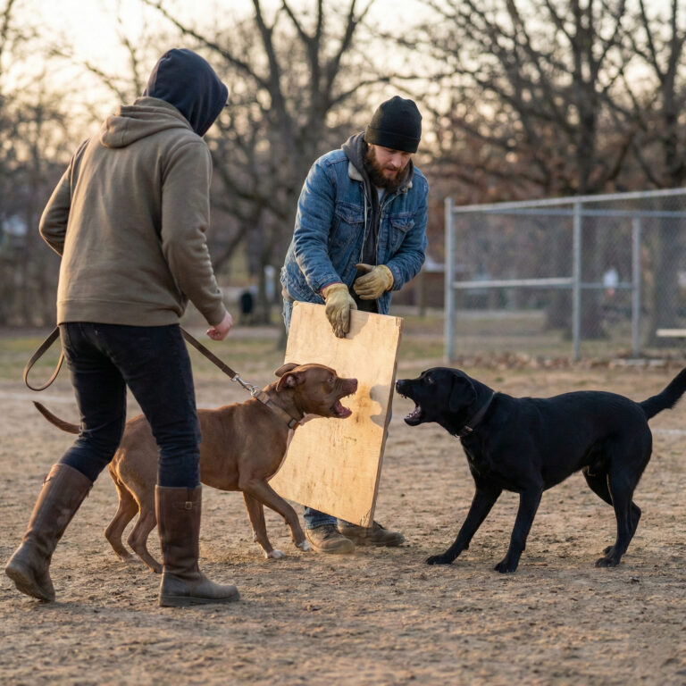 The safest way to break up a dog fight is never to get physically between the dogs. If two people are present, the most effective