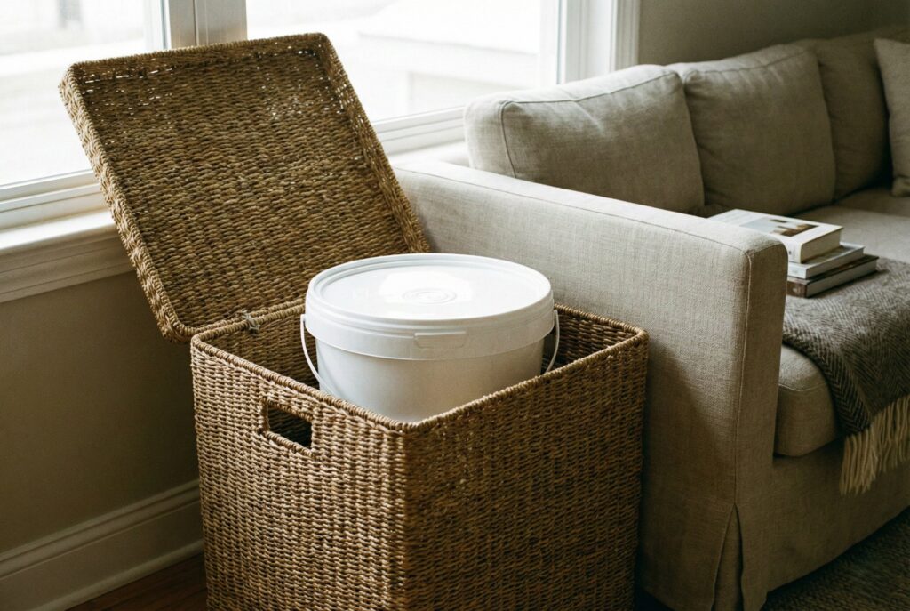 If you want your dog food storage to blend into a living room or dining area, a large, sturdy wicker basket with a lid can work. The trick is that you cannot put food directly in it. You must find an airtight plastic container that fits inside the basket. The basket acts as camouflage for the ugly plastic bin.