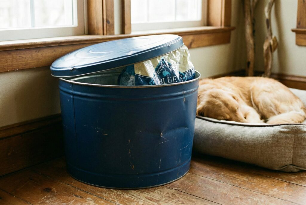 For a retro or DIY vibe, those large metal tins that popcorn comes in during the holidays can be repurposed for dog food storage. They are metal, so they are rodent-proof. However, the lids are rarely perfectly airtight. If you use this method, it is vital to use the “bag-in-bin” technique to ensure freshness. You can spray paint the outside to match your decor.