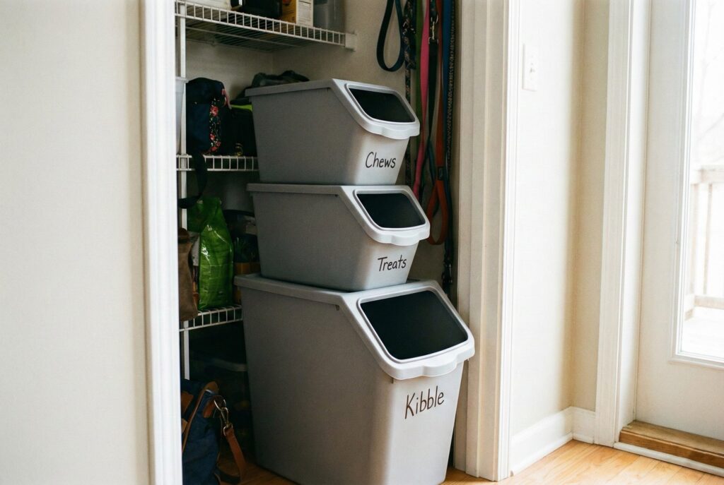 If you are short on floor space, look up. Stackable container systems are great for small apartments or tight pantries. You can have a large bin on the bottom for kibble and stack smaller, matching bins on top for treats, dental chews, or canned food. This utilizes vertical space efficiently.