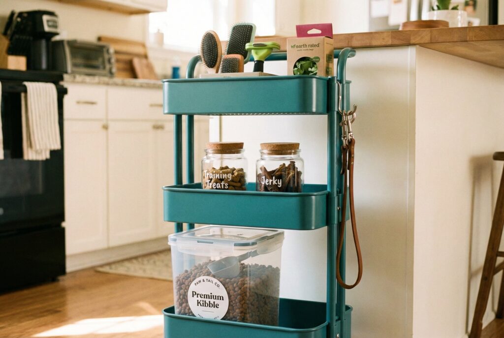 Create a mobile “dog station” using a multi-tiered utility cart (like an IKEA Råskog). Place a medium-sized airtight bin for food on the bottom shelf. Use the middle and top shelves for treat jars, leash storage, poop bags, and grooming tools. You can roll the whole station wherever you need it.