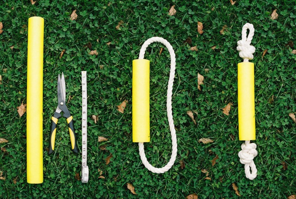 Take a standard, brightly colored pool noodle (yellow or blue is best for a dog’s vision). Use a serrated knife to cut a section about 10 to 12 inches long. Take a sturdy nylon rope and thread it directly through the hollow center of the noodle. Tie a large, thick knot at both ends of the rope so the noodle cannot slide off. Leave about 6 inches of extra rope on one end to serve as a throwing handle.