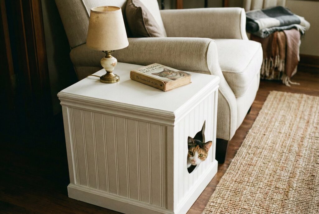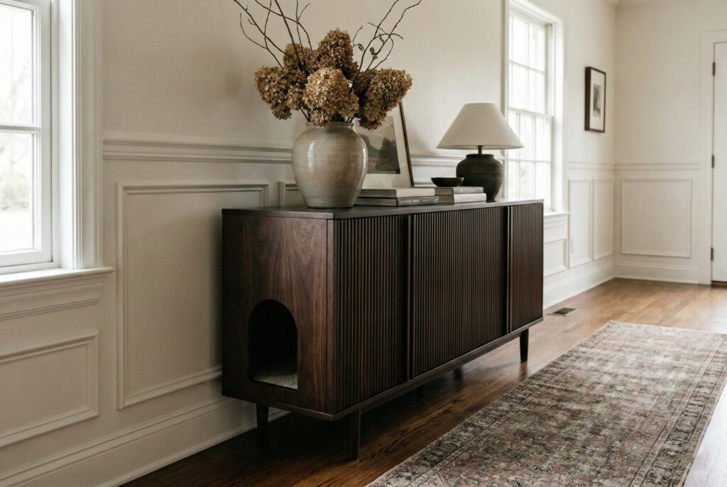 While technically a “house” for their bathroom, enclosed wooden litter box furniture is a massive category of indoor cat houses. These units are designed to look like high-end sideboards, buffets, or benches, completely hiding the unsightly litter pan inside.