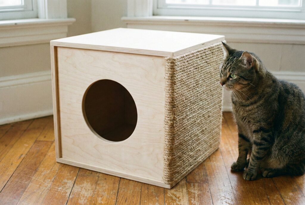 - How to Build It: Purchase half-inch or three-quarter-inch birch plywood. Cut six identical square panels (e.g., 18 by 18 inches). On the front panel, use a jigsaw to cut a large circular entrance. On one of the side panels, cut a few smaller ventilation holes. Assemble the cube using wood glue and brad nails. To make it multi-functional, wrap one of the solid exterior side panels tightly with natural sisal rope, securing it with heavy-duty staples or non-toxic glue.