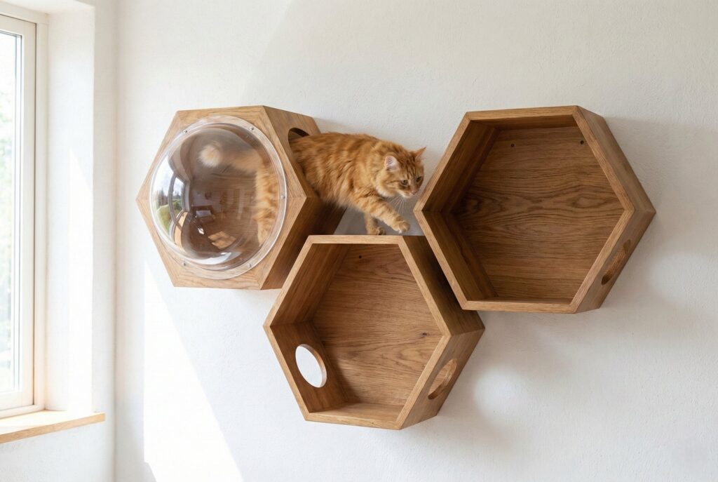 For a highly customizable and architectural look, modular wooden hexagons are fantastic. These six-sided wooden rings can be bolted together on the floor to form a honeycomb structure, or mounted individually on the wall to create a feline climbing wall.