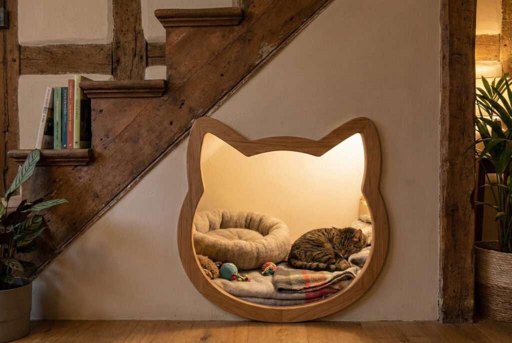 - How to Build It: This requires cutting into the drywall beneath your stairs to expose the wooden framing. Once open, frame out a small cubby area using two-by-fours and line the interior walls with smooth plywood. Create a decorative wooden door or a trim frame with a feline-shaped entrance hole to cover the opening in the drywall. You can even install a small battery-operated motion-sensor light inside.