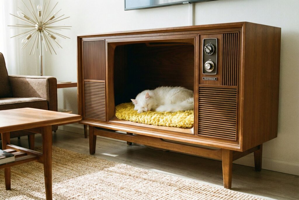 Old, bulky television consoles from the 1970s and 1980s are often thrown away, but their solid wood frames make incredible feline furniture. By gutting the electronics, you are left with a spacious, sturdy wooden box.