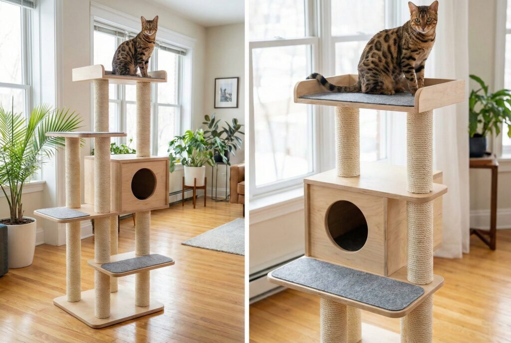 - Features to Look For: Multiple vertical levels, sisal-wrapped support posts for scratching, and at least one fully enclosed wooden box attached midway up the tree for napping. Many feature removable, velcro-attached felt or carpet pads on the platforms to prevent slipping.