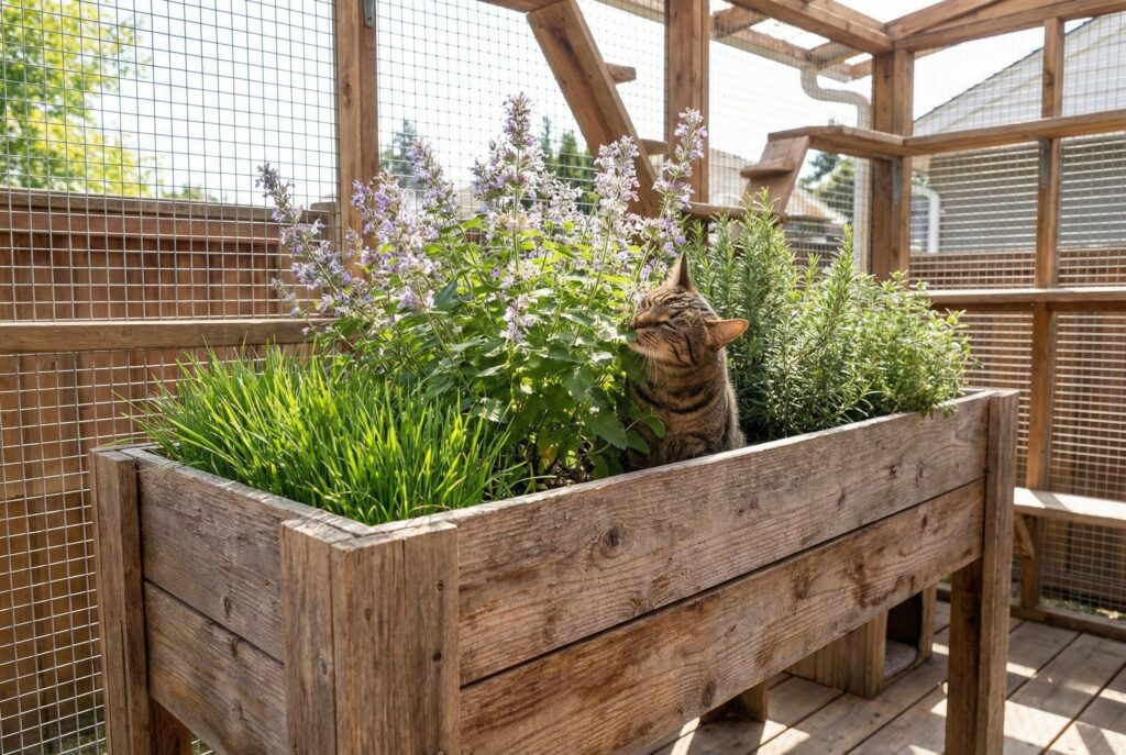 Dedicate a corner of the enclosure to cat-safe plantings. Cat grass (wheatgrass, oat grass) is essential for grazing. Catnip and silver vine provide euphoric stimulation for many cats. Valerian root is another scent many cats enjoy. Herbs like rosemary and thyme are safe and offer interesting smells. Always double-check any plant against the ASPCA toxic plant list before planting.