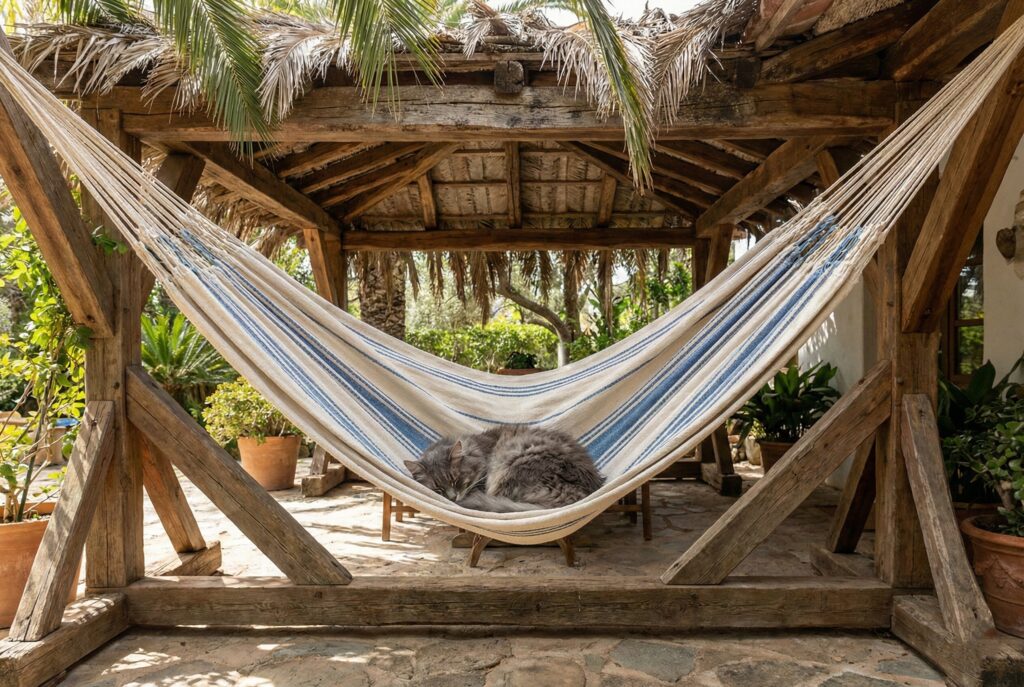 You can buy outdoor-rated cat hammocks made of weatherproof fabric. Alternatively, you can make your own by securely attaching a sturdy piece of canvas or burlap between four corner posts of a structure. Place hammocks in shaded areas so your cat can enjoy the fresh air without overheating on warm days.