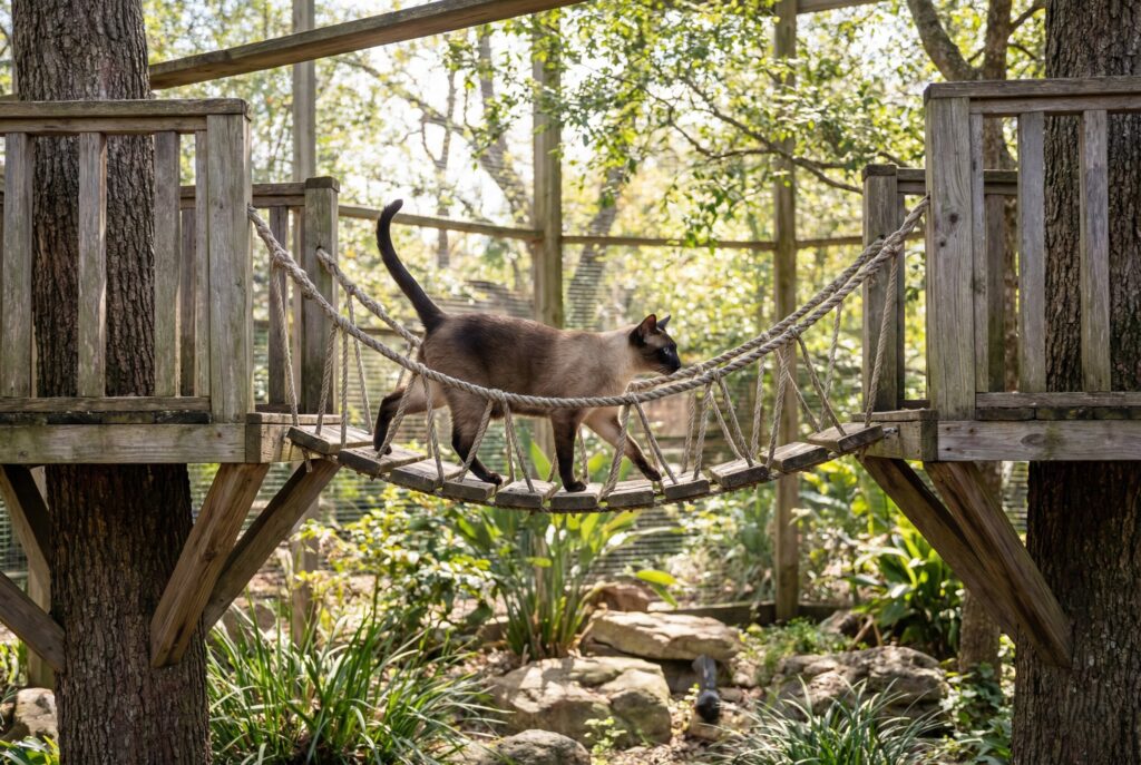 For agile cats that enjoy a physical challenge, incorporate a hanging bridge. This adds an element of instability that tests their balance.