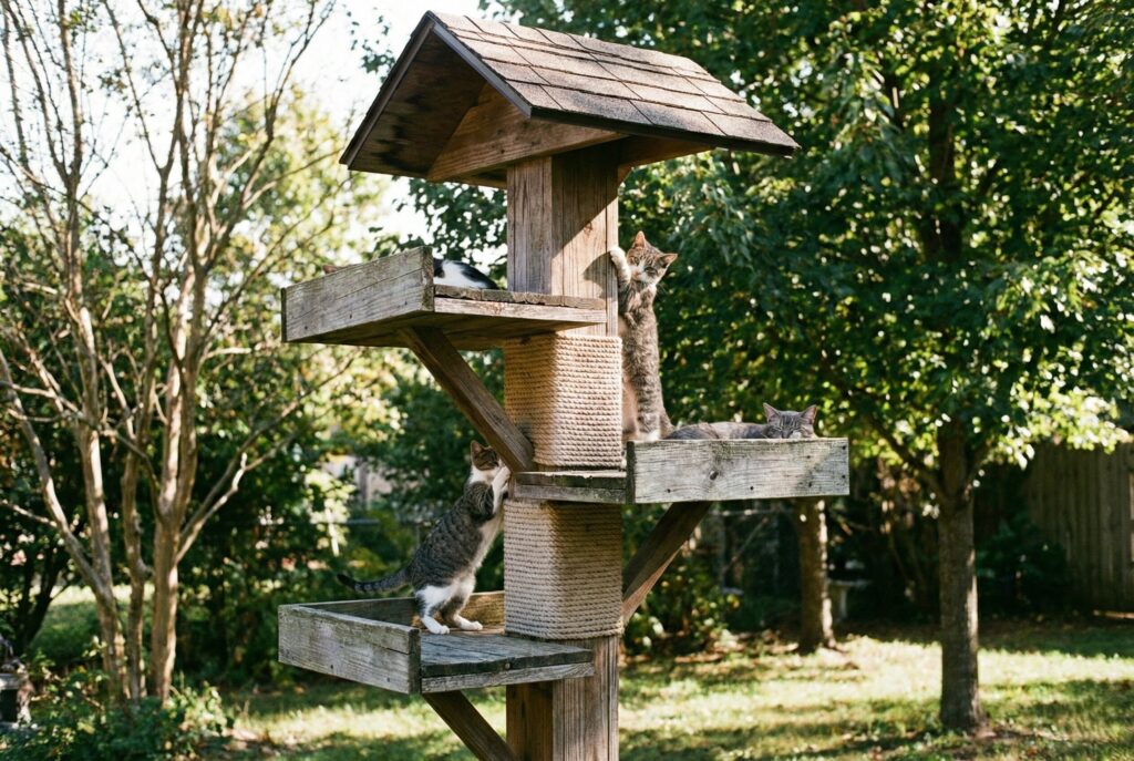 Use pressure-treated lumber or cedar, which naturally resists rot, to construct a sturdy frame. Create staggered platforms that allow the cat to jump from level to level. Wrap central support posts with thick sisal rope for a durable outdoor scratching post. Ensure the base is very wide or anchored to the ground so it cannot tip over during vigorous climbing. The top level should have a roof for shade and weather protection.