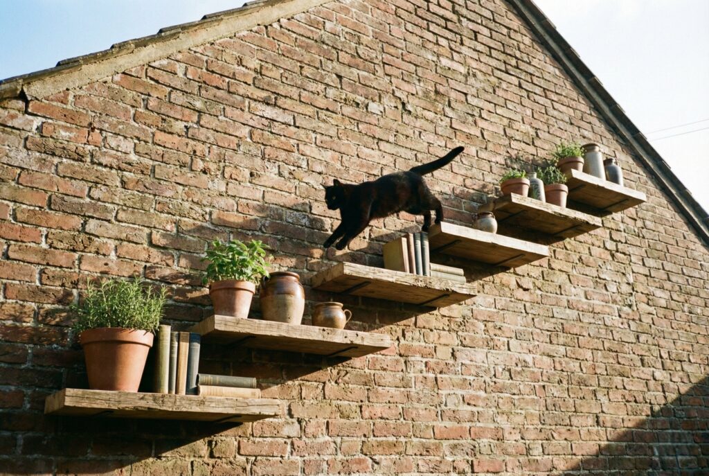 Utilize existing structures to create a “cat highway.” If you have a sturdy brick wall, a wooden fence, or the side of your house that forms part of the enclosure, mount shelves directly onto it.