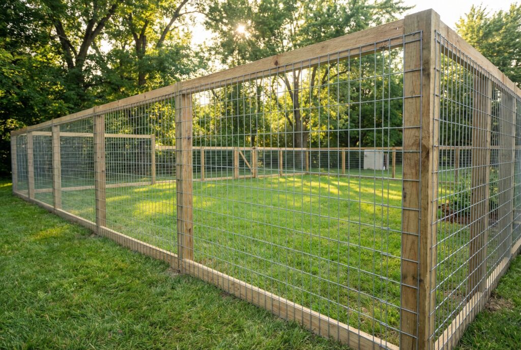 How it Works: You set pressure-treated wooden 4×4 posts into the ground with concrete. Then, you unroll heavy-gauge welded wire fencing and staple it securely to the posts.