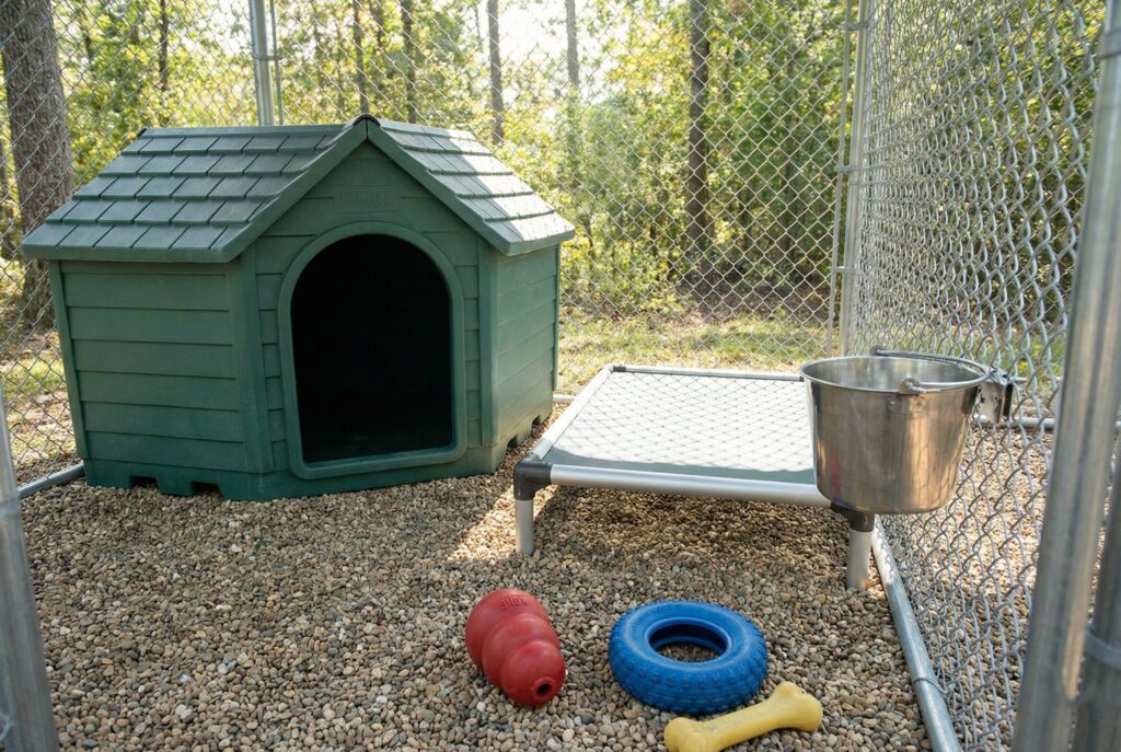 Even if the pen has a roof cover, a dog house inside the pen is recommended. It provides a den-like sense of security and a retreat from wind or cold drafts. Place a raised cot inside for them to lie on; elevated beds allow airflow underneath and keep them off cold or damp ground.