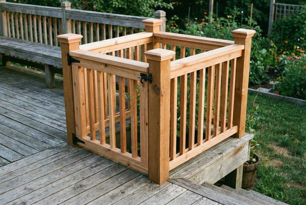 This is a smaller pen attached directly to a back door, porch, or deck. It usually involves building a small railed enclosure on an existing deck or extending a small fenced area onto the grass right off the patio steps.