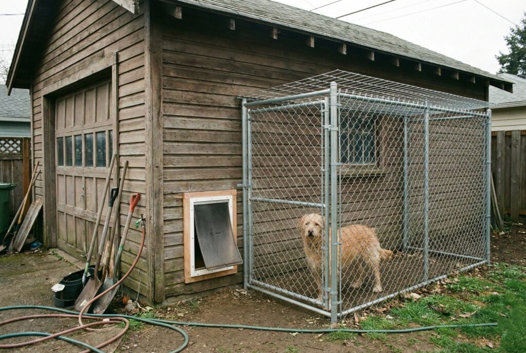 If you have an unused section of a garage with access to an exterior door, you can create an indoor/outdoor setup. You build a secure pen just outside the exterior door and install a dog door in that door.