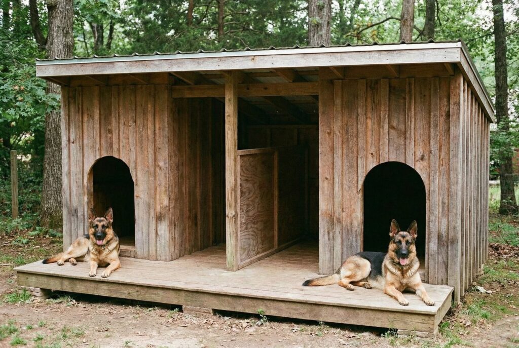 If you have two dogs that love spending time outside, a duplex is a fantastic space-saving solution. It is essentially one large, extra-wide doghouse divided by an internal partition wall. You can build the partition to go all the way to the ceiling for separate rooms, or leave a gap so the dogs can snuggle and share body heat while still having their own designated doors.