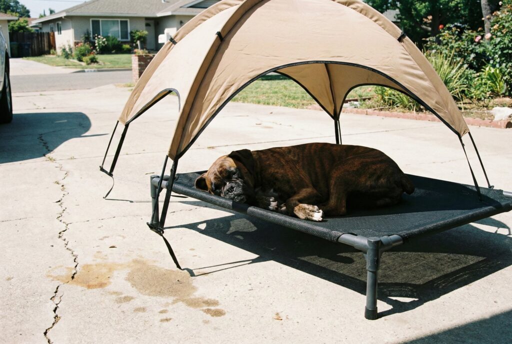 Sometimes a simple, functional approach is best for hot weather. This design combines a raised mesh cot with an attached overhead canopy. The raised bed keeps the dog off hot concrete or insect-filled grass, and the mesh allows air to circulate under the dog’s body, which is highly effective for cooling.