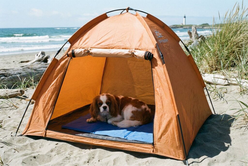 Not all outdoor shelters need to be permanent structures. If you take your dog camping, to the beach, or to weekend sporting events, a portable pop-up tent is essential. These are made from heavy-duty, UV-resistant nylon and use flexible fiberglass poles to pop into shape in seconds. They provide instant shade and a safe space in unfamiliar environments.