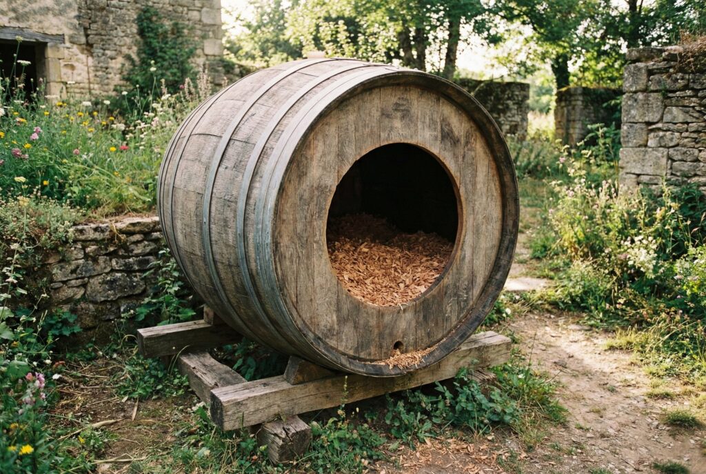 - Materials Needed: Clean, empty 59-gallon wine barrel, jigsaw, scrap wood for chocks, and waterproof sealant.