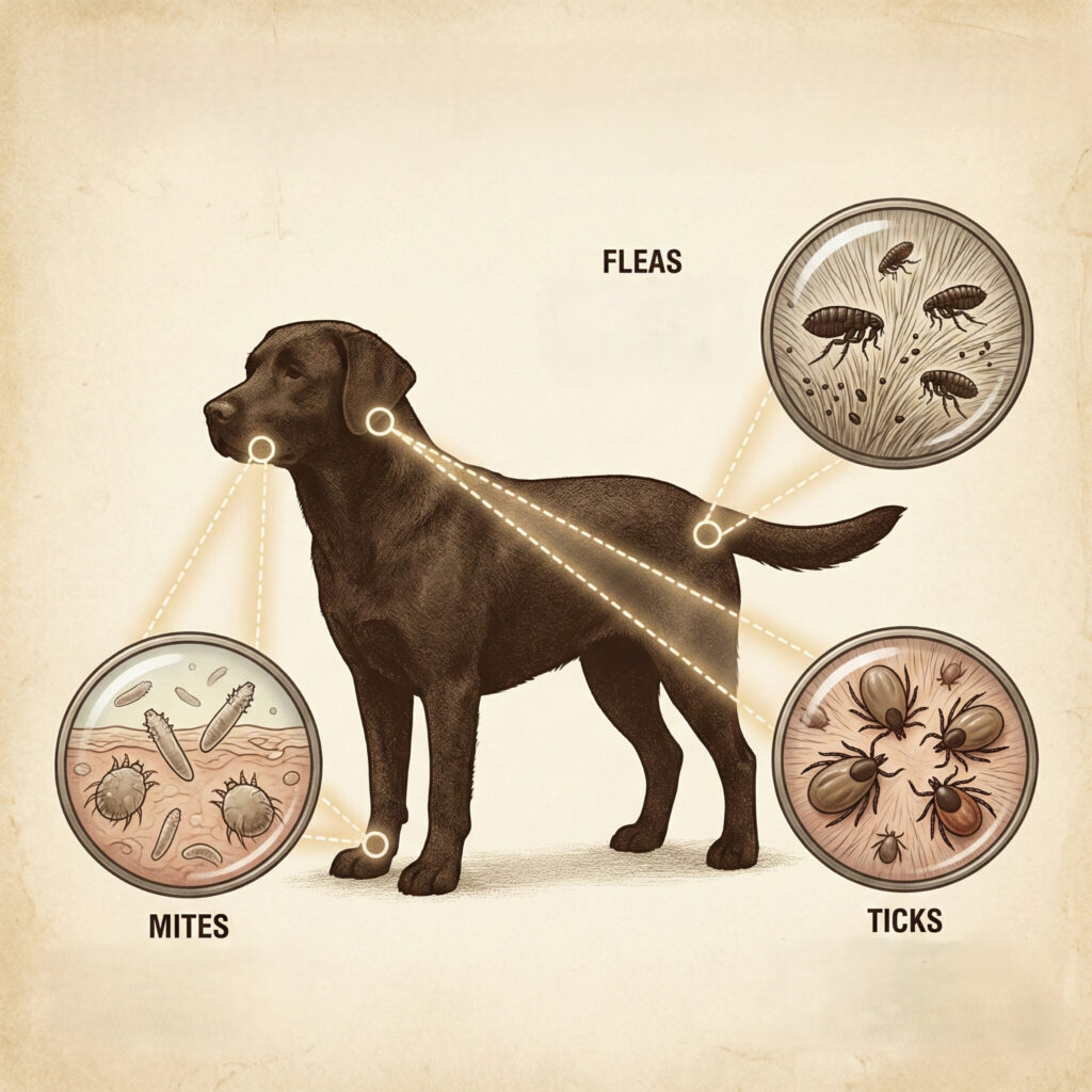 Fleas, ticks, and mites are the most common external parasites affecting dogs. Fleas are wingless insects that cause intense itching and can transmit tapeworms. Ticks are arachnids that latch onto skin to drink blood and are major carriers of diseases like Lyme disease. Mites are microscopic parasites that burrow into the skin or ears, causing mange and severe irritation. Prevention involves regular use of veterinary-approved topical creams, oral chews, or collars.