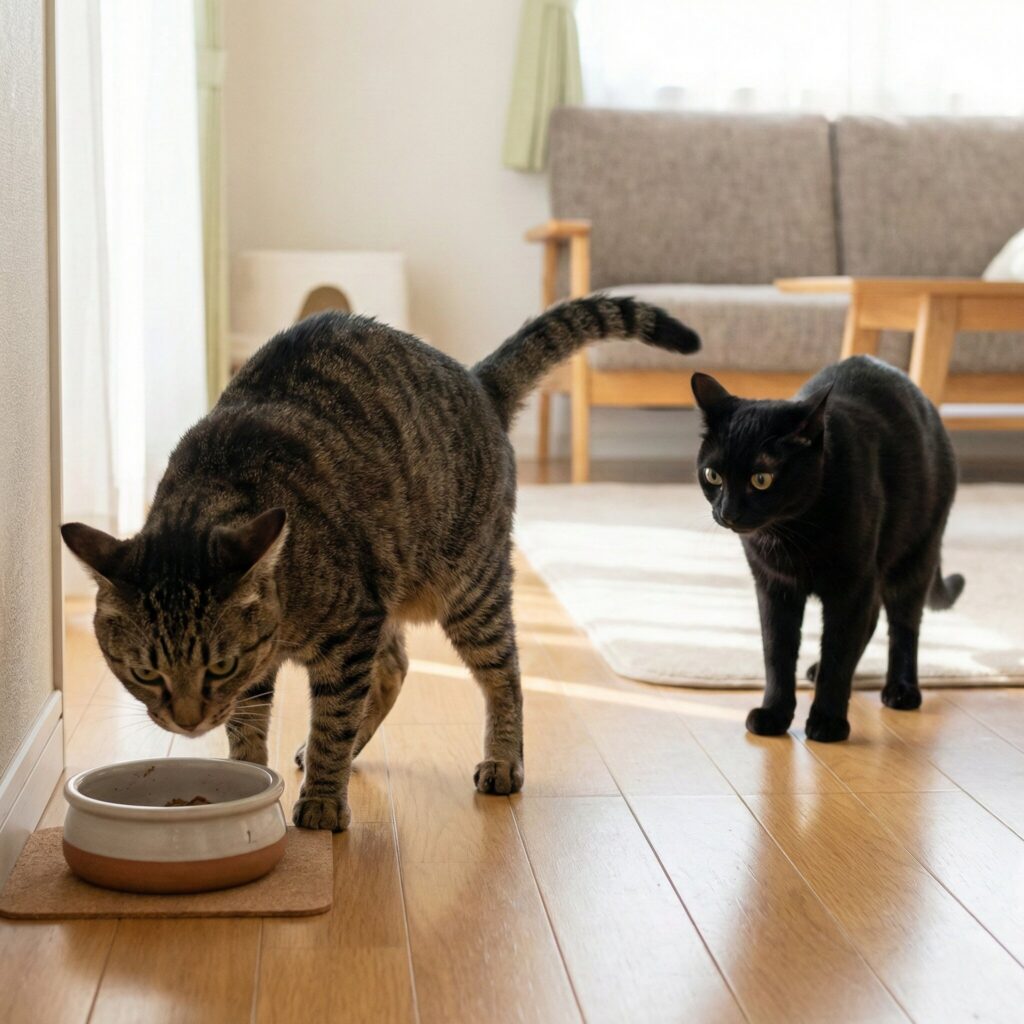 This is the most primal trigger. In the wild, food is survival. In a home, even if bowls are full, a cat may feel that access is threatened. This often happens when cats are fed side-by-side. One cat eats quickly and then pushes the other away, or simply stares until the other cat leaves their bowl.