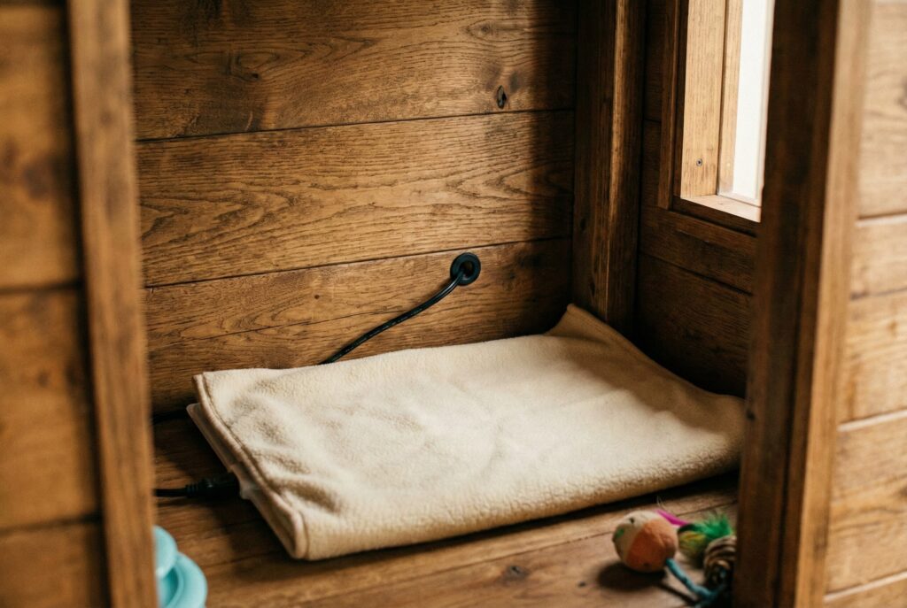 A truly heated house requires access to electricity. The best approach is to use an outdoor-rated, pressure-sensitive pet heating pad placed on the floor of the wooden house. You must drill a small hole near the floor to pass the power cord through so the cat cannot chew it. Some high-end store-bought wooden houses come with heated floors built-in. This is a lifesaver for short-haired or older cats in freezing temperatures.