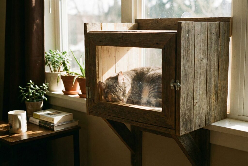This is a wooden box that mounts securely to a windowsill and often requires braces that push against the wall below the window for support. The box extends outward, and the top is usually open or has a clear acrylic lid so the cat can bask in the sun while being contained. The entry is from the windowsill side. It requires careful construction to ensure it can hold the cat’s weight securely without damaging the window frame.